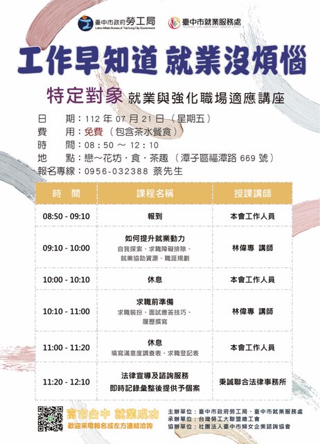 歡迎報名參加,當天有就業輔導講師、法律事務所律師及心理輔導諮商老師。人數有限20