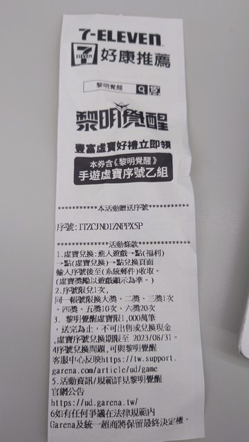 物品名稱:統一超商黎明覺醒虛寶序號