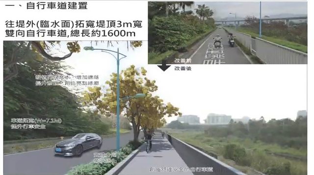 道以拓寬道路,並由觀光旅遊局建置1.6公里堤頂自行車道,工程經費約3300萬元,水利