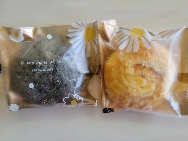 雙色太陽餅一種是傳統原味,另一種則是黑芝麻。餅皮走