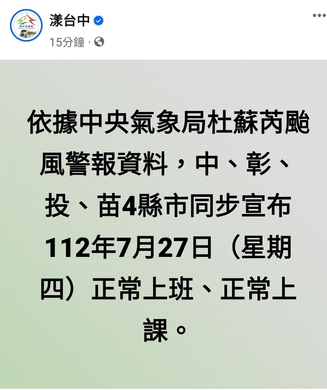 → cccmn : 住中部最慘的就是南北都放 就我們正常上班 07/26 18:28