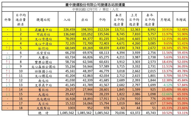 標題Fw: [情報] 台中捷運112年7月各站旅運量