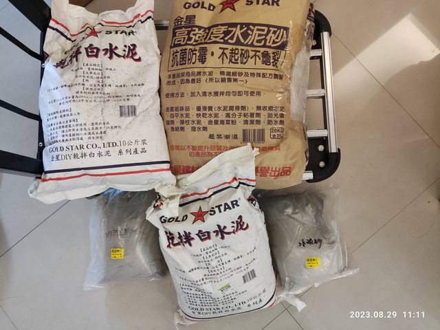 物品名稱:白水泥10公斤裝兩包及水泥沙20公斤兩包,兩小包水泥沙5台斤裝.