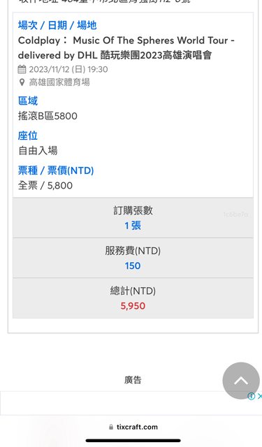 標題[交易] 售 coldplay 11/12搖滾區1張