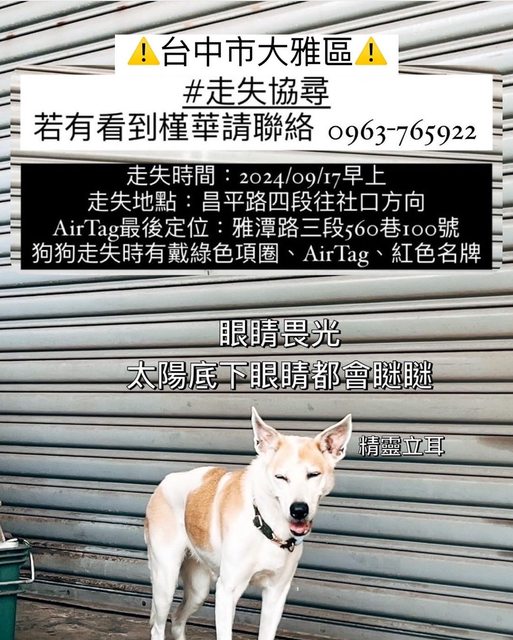 遺失地點:台中市大雅區雅潭路三段560巷