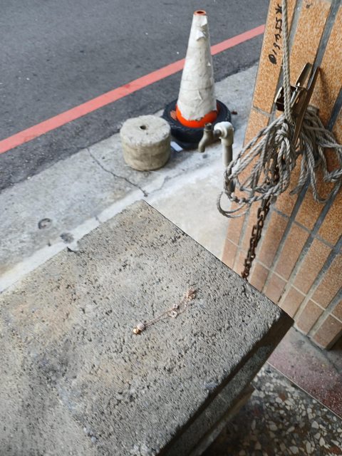 下午傍晚,在甘州五街及西屯路的騎樓地板上,發現一條手鍊,順手放在旁邊的石頭圍欄上(如圖)。