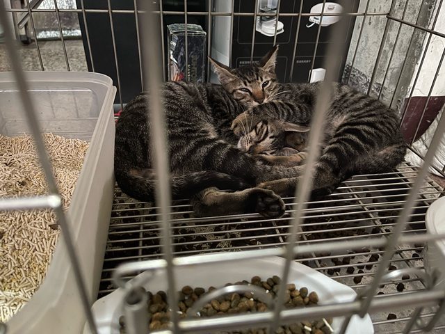 兩隻公幼貓,外型皆深色虎斑,差別在體型大小,然後較大隻的那隻顏色更深且性格很沈
