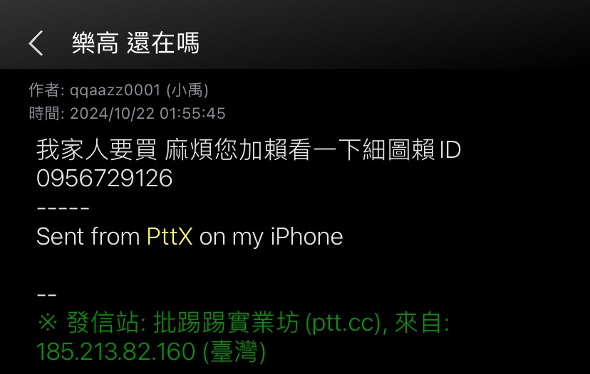換ID囉!qqaazz0001 所有收到交易信件轉寄給 法務站長a3225737 台中版交易本來規定就面交 請在交易前 請點選查看對方上站次數及發文數量 若是異常的低代表是超級新手 就要留意是否為釣魚網站 利用簽帳或信用卡3D認證話術是會把卡刷到爆 目前累計黑名單如下 ID:shen129353 #1d39ylAV (cat) ID:twtw1 #1d4rldM4 (TaichungBun) ID:qqaazz0001 #1d5rqWvl (ShuangHe) -- Sent from my Sharp AQUOS R8 pro PiTT // PHJCI -- ※ 發信站: 批踢踢實業坊(www.ptt-site.org.tw), 來自: 210.209.240.3 (臺灣) ※ 文章網址: https://www.ptt-site.org.tw/TaichungBun/M.1729637880.A.CD2