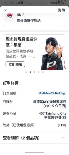 看到脆說 今天用熊貓點肯德基有滿400折150