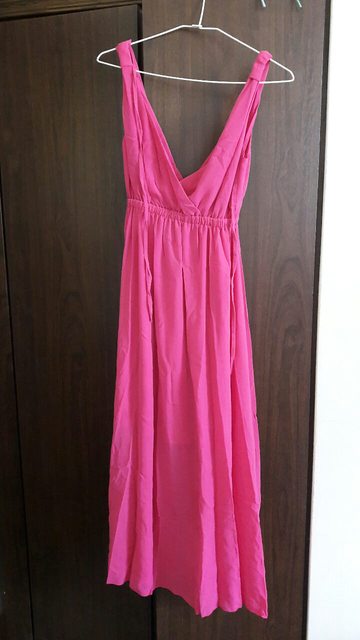 3.【全新】bebi海邊度假顯瘦純色氣質雪紡連衣裙V領吊帶沙灘裙子-玫紅