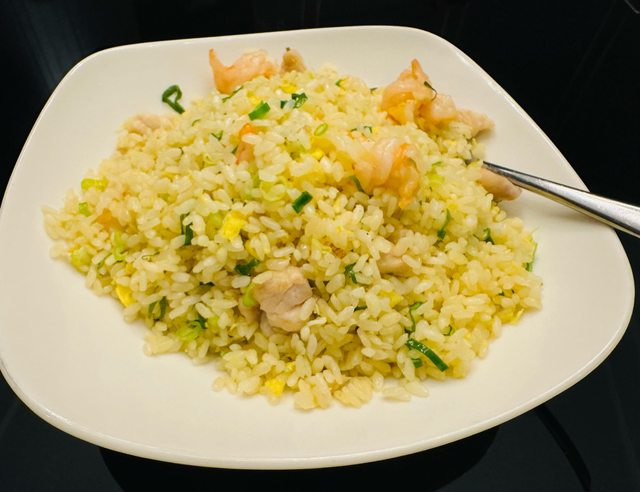 潮州炒飯,飯粒粒粒分明,拌炒蝦仁、豬肉丁、蛋與青蔥,沒有太重鹹的調味,屬潮州菜