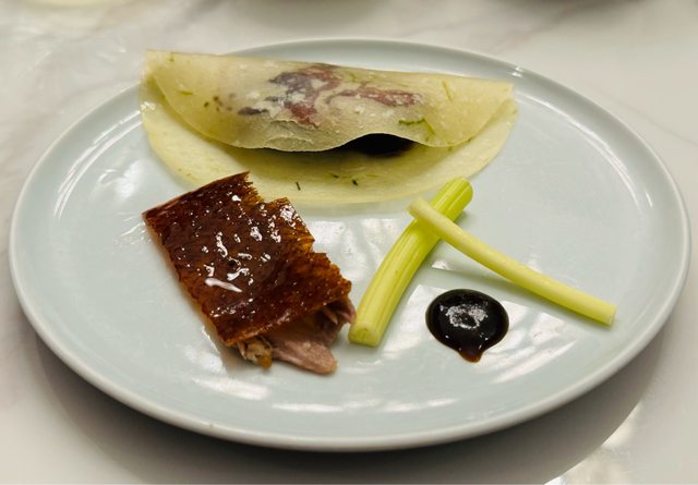 邊幫忙片鴨與包烤鴨捲餅,鴨肉嫩不柴伴著鴨油香,甜麵海鮮醬鹹甜適中,手工餅皮薄透