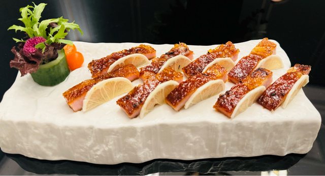 喀滋地脆口,帶著濃濃的焦糖香氣,用松阪豬取代梅花肉,軟嫩多汁,配切得極薄的檸檬