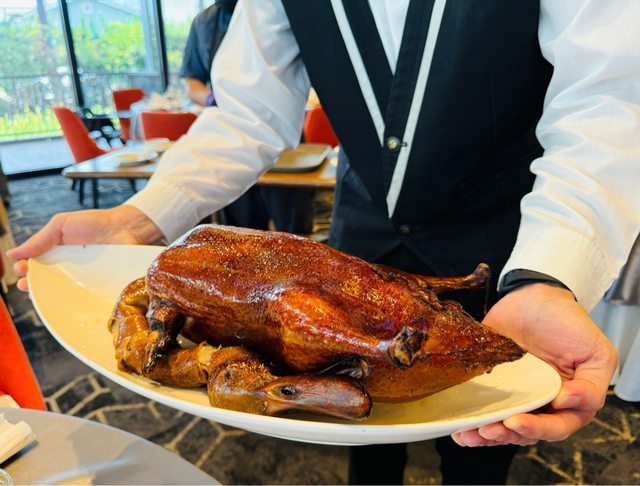 肥胖飽滿的宜蘭櫻桃鴨,採廣式脆皮烤鴨的作法,鴨皮烤到色澤棗紅油亮酥脆,服務員桌