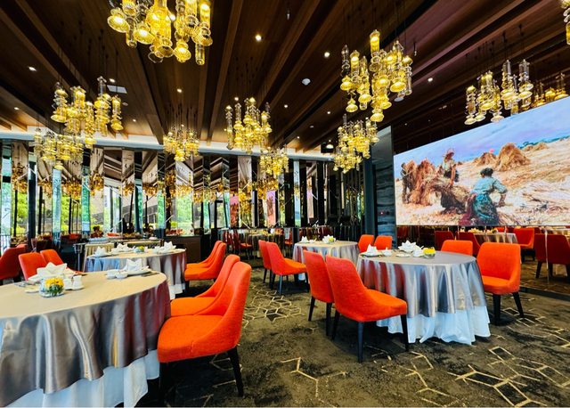 餐廳裝潢高貴典雅,華麗金黃水晶吊燈搭配大紅座椅,格紋黑色絨毛地墊,極盡奢華喜氣