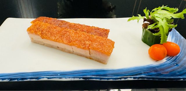 脆皮金磚燒肉,金黃焦脆外皮,厚五花肉油花分佈均勻,肥瘦適中,肉嫩帶脆,與与玥樓