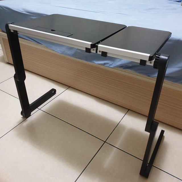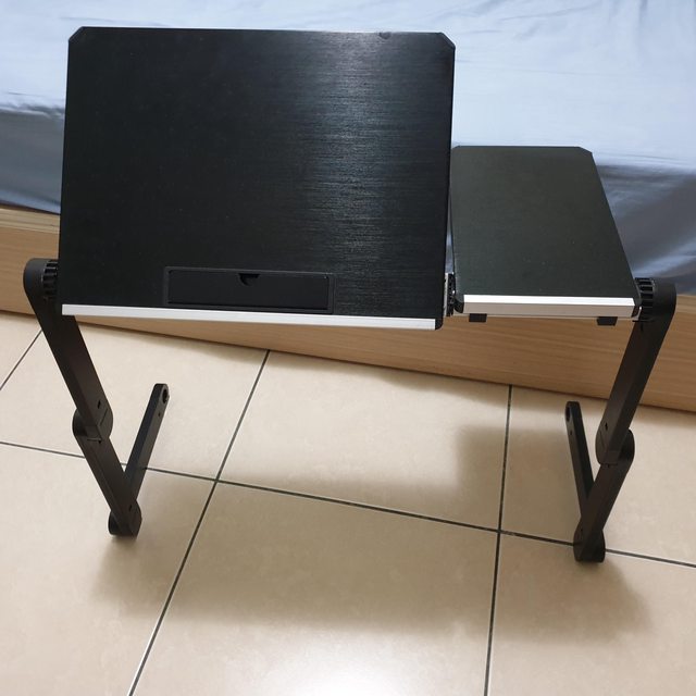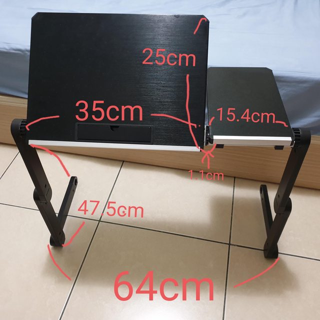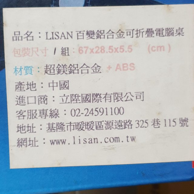<售出>5.LISAN百變鋁合金可折疊電腦桌100元 ■2015年購入,使用約半年後就收起來,閒置多年。表面因濕氣有些氧化白點,遠看不明 顯,不影響使用,不介意再購買。 規格: ①材質:超鎂鋁合金+ABS ②產地:中國 ③桌子尺寸:520*25 mm ④淨重:1.3 KGS ⑤最高高度:47.5CM