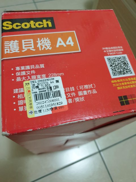 <洽中>2.3M SCOTCH A4 護貝機 TL902 贈護貝膜42張 300元 ■2021/5/11於九乘九購入,用2~3個月左右就收起來了,外觀完整。 ■可能因護貝溫度偏高,護貝後有輕微波紋,在光線下反光才看的到,不仔細看不太明顯 ,如圖、影片。因幾百元的小電器送修不划算,故便宜賣,適合護貝消耗性用品,如菜單 、場地 佈置、教室佈置、學習字卡、名牌... ■贈沒用完的護貝膜42張,價值約70元。 ■盒外邊緣有退色,不影響功能。 ■製造日期:2019/04/12