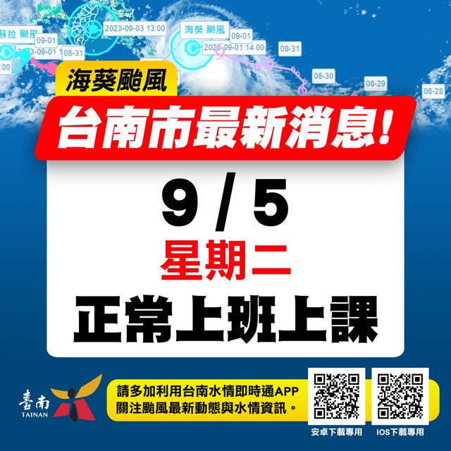 【南市府公告】 根據中央氣象局資訊,明(5)日臺南市未達停班、停課標準。 臺南市明(5)日正常上班、正常上課。 http://i.imgur.com/BpaQ8Gr.jpg