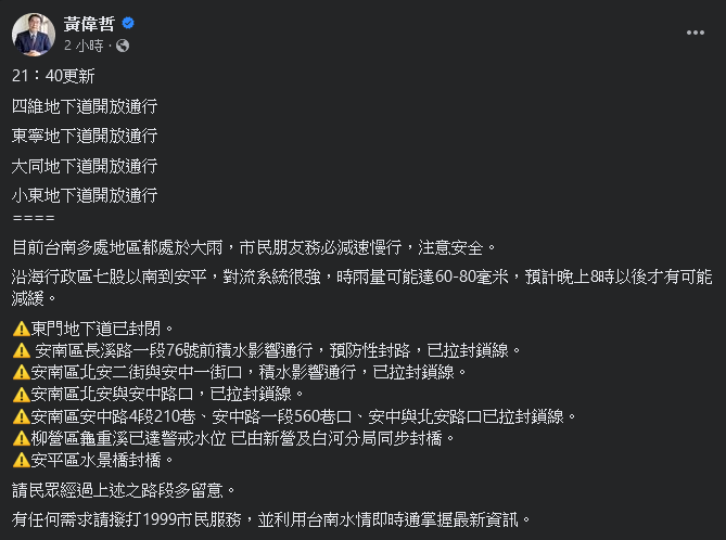 有任何需求請撥打1999市民服務,並利用台南水情即時通掌握最新資訊。