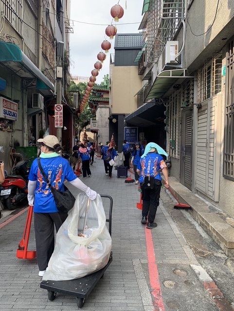 中沿街均有環保志工協助清理路面垃圾,確保道路環境整潔,遶境過程由市府提供環保鞭