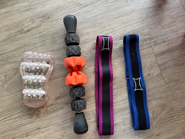 由左至右:腳底按摩器、滾輪按摩棒、彈力帶(以上皆有使用過)