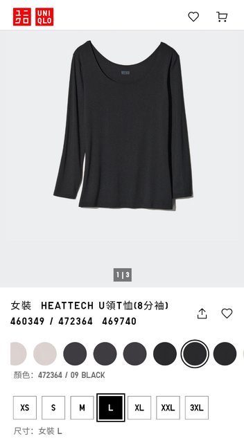 1. HEATTECH U領(8分袖) 黑色L