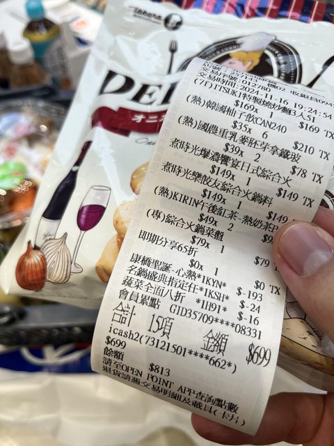 買了打折的蔬菜火鍋組,結果在買一送一區經不起誘惑就開始亂買,哇...午後、國農、柚子茶,還有日本進口的炒麵都買一送一(晚間限定,頗奇妙),還好我算得準,扣了一堆後有滿688,再多給50點,讚xd
