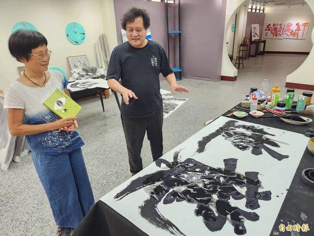 )書寫 「逆襲」,左為黃春蘭。(記者王涵平攝)