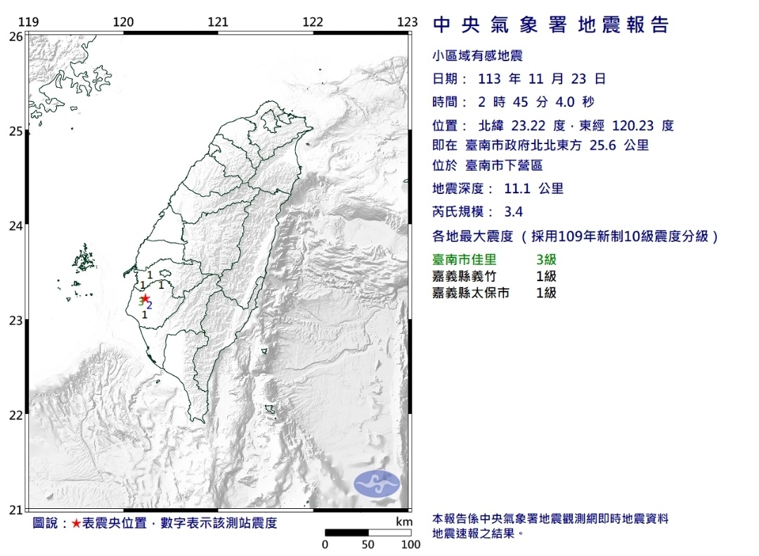 今(22)日晚間8時40分,台南市佳里區發生芮氏規模5.4地震,震央在台南市政府北方23