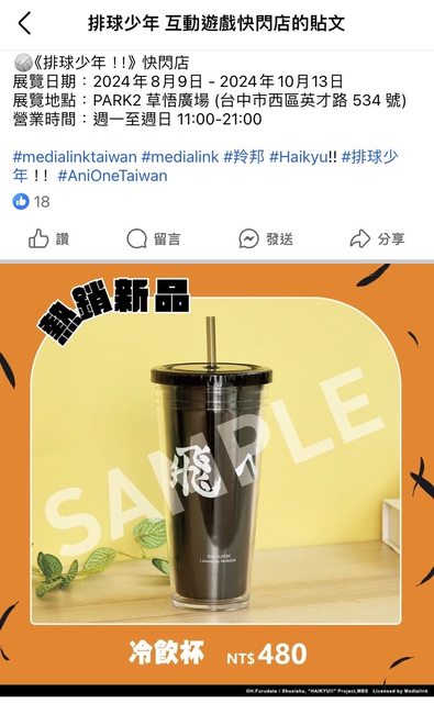 排球少年快閃店冷飲杯,原價 $480 元,賣 $380 元(全新,僅拆封檢查)