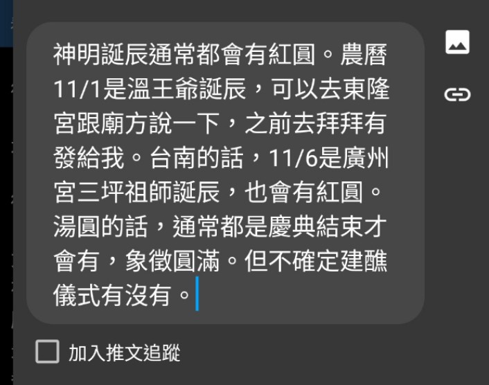 → vbphone: 謝謝你~現在宴客普遍都炸湯圓,但神明說要甜湯,苦惱>"< 11/28 23:06