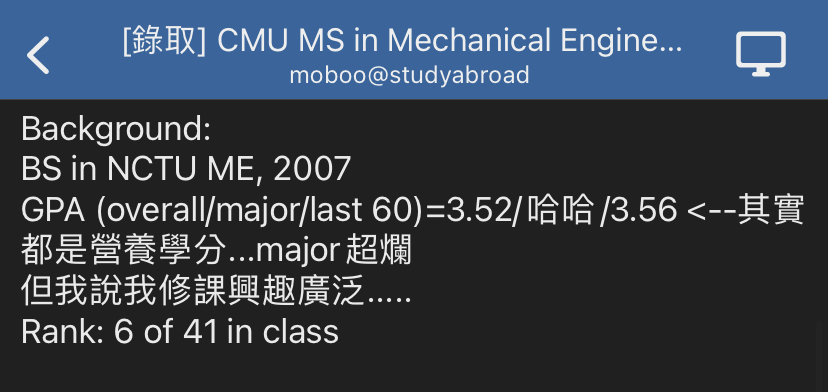 推 ejnfu : 不是要槓 但你成績又不差 上CMU很正常吧 09/27 06:58