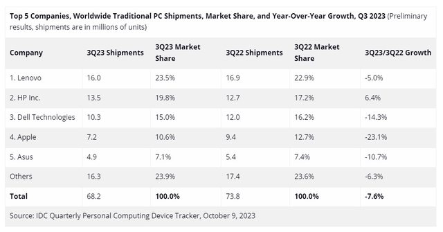 根據市場研究公司IDC 10月9日發佈的最新報告,2023年第三季,全球PC出貨量較2022年