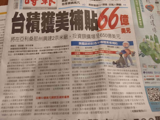 : 表示,美國政府的資金允許台積電增加在美國的投資,這將使得台積電的美國業務能夠更