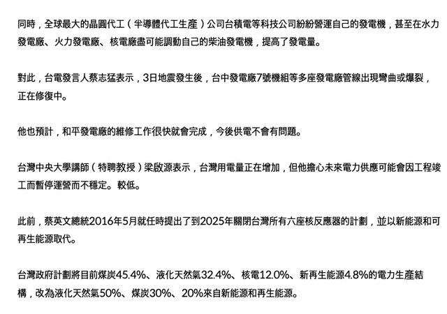消息人士透露,花蓮和平發電廠等八處發電設施因強震受損,目前台灣尖峰電力需求昨日