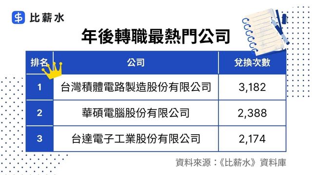 《比薪水》年後薪水情報兌換最多的前三名公司為台積電(2330)、華碩(2357)、台達
