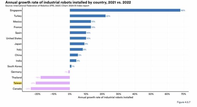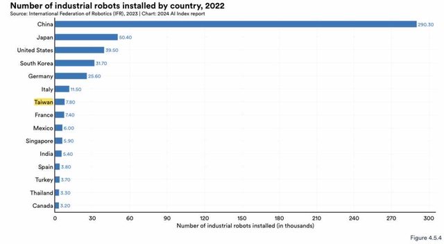 台灣的工業機器人安裝數量遠遠比不上前面的AI強國