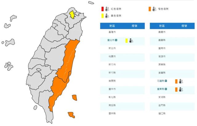 橙色燈號,有攝氏38度極端高溫出現的機率;花蓮縣為橙色燈號,有連續出現36度高溫的