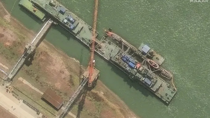 攝的衛星照顯示,一艘停靠在長江沿岸碼頭浮在水面的潛艦,最後進行設備組裝準備出海