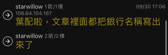 推 starwillow : 奇怪不是葉那幹嘛寫那麼詳細連銀行 106.64.104.167 09/30 19:39