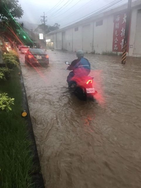 基隆大武崙積水,民眾冒雨騎車上班。(網友授權提供)