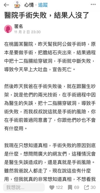 → ulamong : 開刀傷到別的部位 不是醫生的疏失220.138.126.233 11/07 15:14