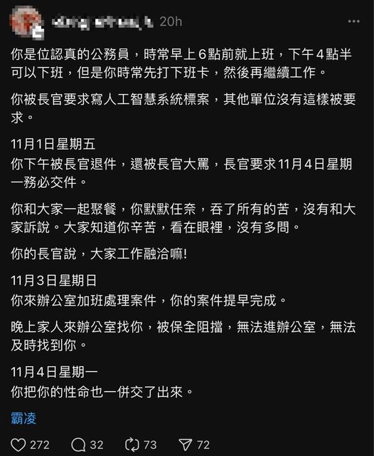 標題Fw: [新聞] 勞動部39歲公務員輕生...知情人爆:上司