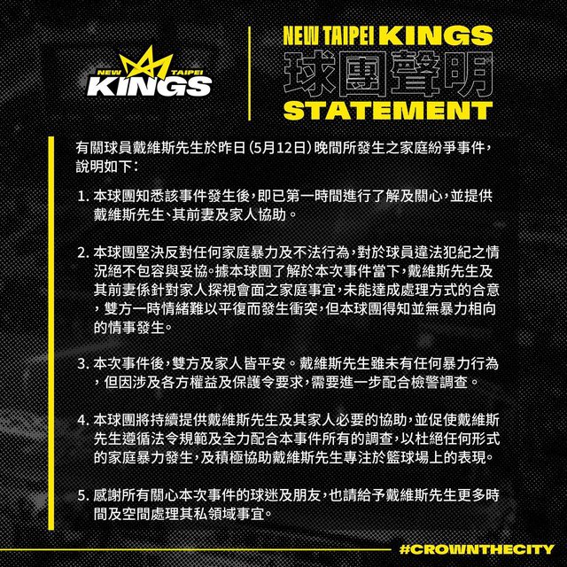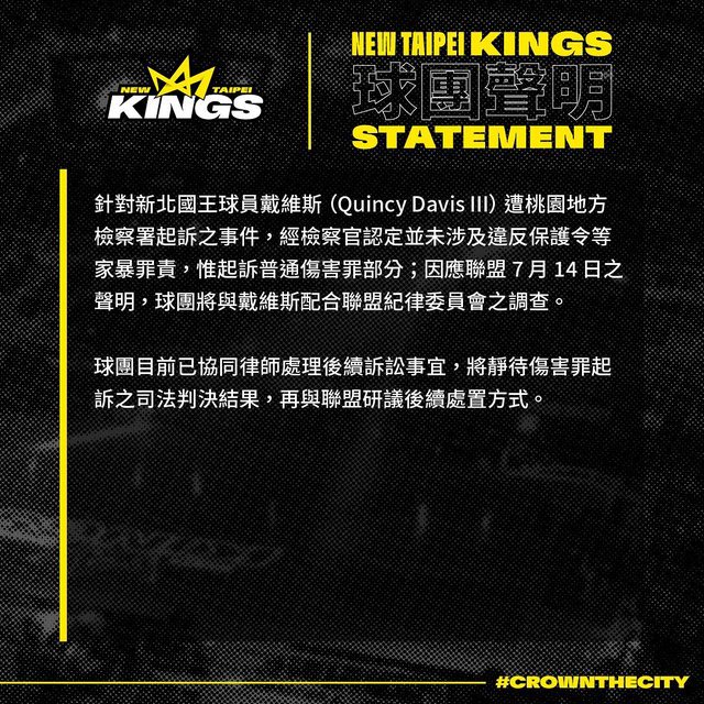 新北國王籃球隊關於球員戴維斯(Quincy Davis III)涉及事件的聲明: