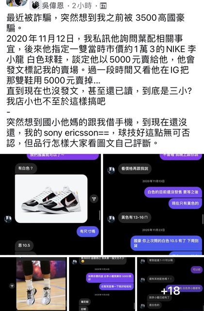 如題 來源 https://www.facebook.com/groups/577859626536649/permalink/1060929044896369/?mi bextid=W9rl1R 最近被詐騙,突然想到我之前被 3500高國豪 騙。 2020年11月12日,我私訊他詢問葉配相關事宜,後來他指定一雙當時市價約1萬3的NIKE 李小龍 白色球鞋,談定他以5000元賣給他,他會發文標記我的賣場。過一段時間又看他 在IG把那雙鞋用5000元賣掉... 直到現在也沒發文,甚至還已讀,到底是三小? 我店小也不至於這樣搞吧 - 突然想到國小他媽的跟我借手機,到現在還沒還,我的sony ericsson==,球技好這點無 可否認,但品行怎樣大家看圖文自己評斷。 https://i.imgur.com/37M49un.jpg
