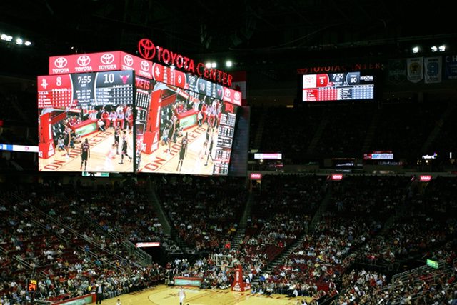 休士頓火箭隊 豐田中心,目前是NBA的場館裡尺吋第二大的螢幕,旁邊在觀眾席最上方也