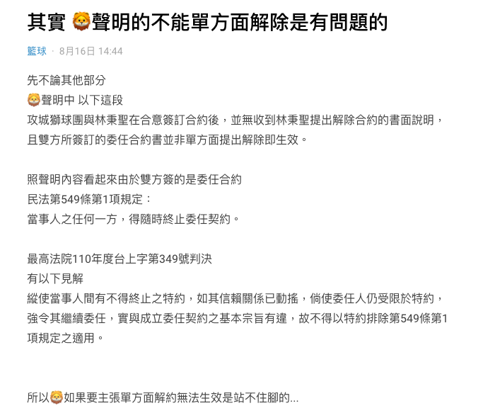 beautydots : 坦白說以往簽委任契約球團主動終止合約容易些,SBL 08/16 15:07