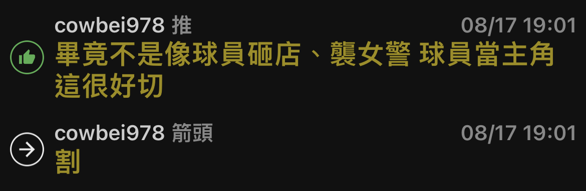 推 cowbei978 : 畢竟不是像球員砸店、襲女警 球員當主角 這很好切 08/17 19:01