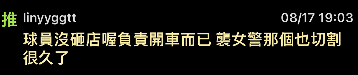 推 linyyggtt : 球員沒砸店喔負責開車而已 襲女警那個也切割很久了 08/17 19:03